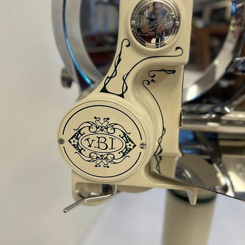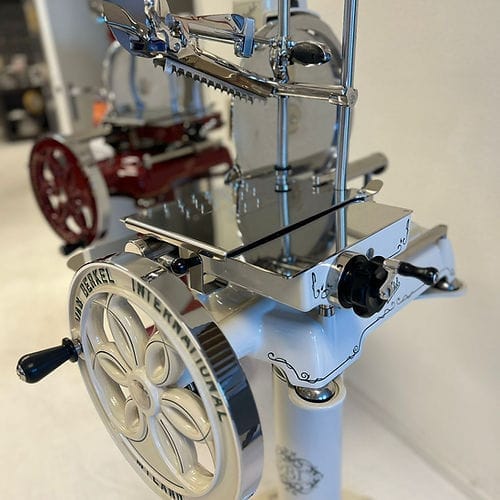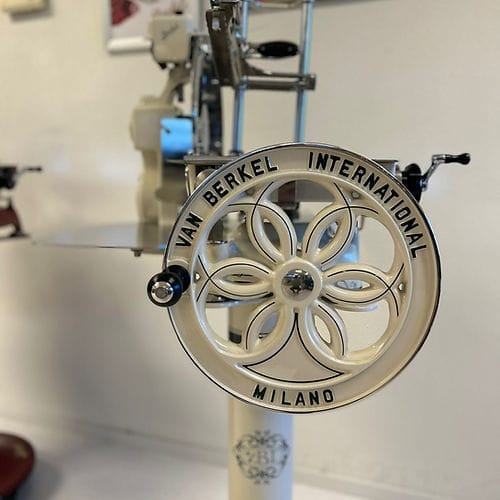 Het hart van de machine is het 319 mm dikke verchroomd stalen mes (100Cr6) met een professioneel profiel, dat afval reduceert en zorgt voor perfecte plakjes. Het geavanceerde snel-opruim- en terugzetsysteem van de voedselplaat, in combinatie met een handmatige millimeterknop, zorgt voor een perfecte positionering van het product. Het klassieke Berkel-torenontwerp combineert elegantie met een robuust design, versterkt door gouden versieringen op de geverfde onderdelen.