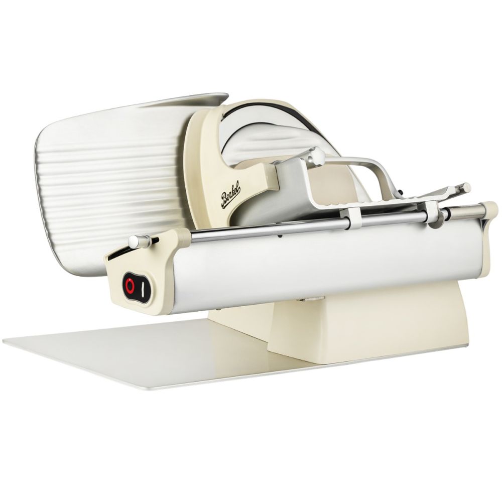 Die Klinge aus verchromtem Stahl mit professionellem Profil sorgt für einen perfekten Schnitt, indem sie Abfall reduziert und gleichmäßige Scheiben garantiert. Der Klingenschutz mit durchgehendem Profil erleichtert das Schneiden, und die schräge Öffnung der Anschlagplatte fördert die Scheibenausgabe für eine optimale Leistung.