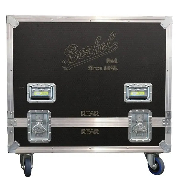 Praktischer schwarzer Transportkoffer mit Details aus Edelstahl, speziell für den sicheren und einfachen Transport der Berkel B114 Schneidemaschine. Der Koffer ist mit Rädern, stabilen Schlössern und dem erkennbaren Berkel-Logo an den Seiten ausgestattet. Dank einer speziellen Aussparung passt die Maschine perfekt und sicher in den Koffer.